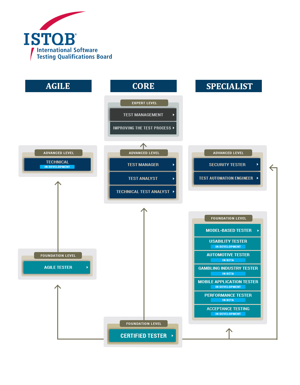 Dla osób, które nie mają jeszcze doświadczenia komercyjnego w testowaniu, jest to potwierdzenie zdobycia pewnej wiedzy teoretycznej, a co za tym idzie będzie to ważny punkt w CV. Warto podkreślić fakt, że certyfikaty ISTQB są najbardziej rozpoznawalne i rozpowszechnione w świecie testowania oprogramowania od wielu lat. Dzięki temu potencjalny pracodawca wie, jaki zakres wiedzy został opanowany przez osobę, która taki certyfikat posiada. Zdobycie certyfikatu na poziomie podstawowym otwiera też drogę do sięgania po certyfikaty na kolejnych poziomach (advanced i expert) lub ścieżkach (agile, specialist). Poniżej znaleźć można aktualną drabinkę certyfikacji.