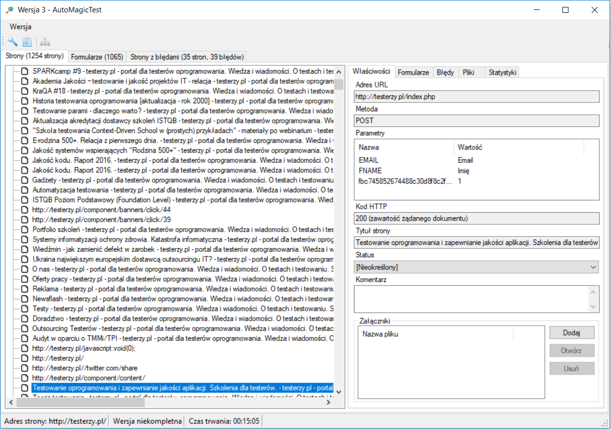 - Mr Buggy 4 – aplikacja służy do analizy stron internetowych i zawiera ukrytą niespodziankę. Gdzieś w czeluściach czai się gra, która pojawi się, gdy przetestowane zostaną wszystkie funkcje. Tym razem wersja zawiera pewne znane błędy, które są wyłączone z testowania. Mamy też możliwość zretestowania 10 defektów, co jest wg mnie fajnym ćwiczeniem dla osób początkujących. Poza tym do przetestowania są m. in. funkcjonalności związane z eksportem raportów, tworzeniem statystyk czy też identyfikacją wybranych typów plików oraz ich wielkości.