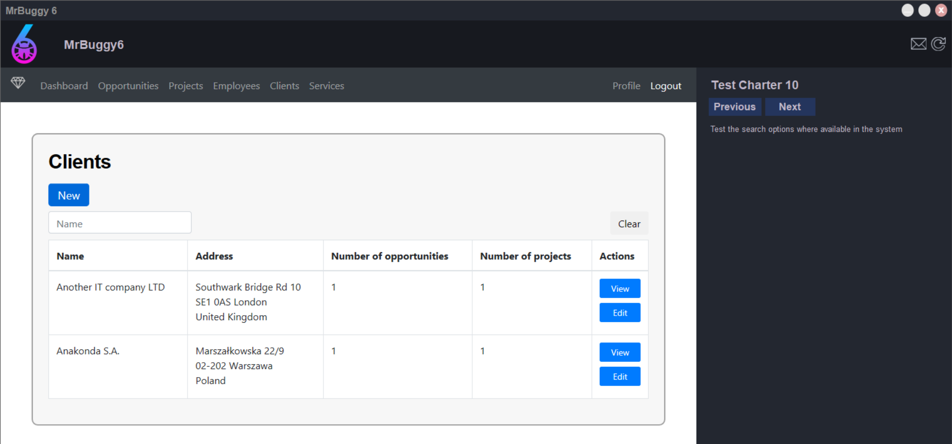 - Mr Buggy 6 – aplikacja przeznaczona jest dla osób zarządzających firmami, które świadczą usługi testowania. Wspiera procesowanie nowych okazji na projekty (opportunity) oraz zarządzanie istniejącymi projektami. Ta wersja wyglądem przypomina mi Mr Buggy 3 ze względu na prawy panel, w którym zdefiniowany jest obszar do testowania. Tutaj pojawiają się zadania, w których musicie sprawdzić m. in. ustawianie hasła użytkownika, edycję profilu, walidacje, wyszukiwania oraz filtrowania. To wydanie zostało przygotowane z myślą o testach eksploracyjnych i nie mamy tutaj specyfikacji, która powie nam, jak poszczególne funkcje powinny działać. Świetnie się nadaje dla osób początkujących.