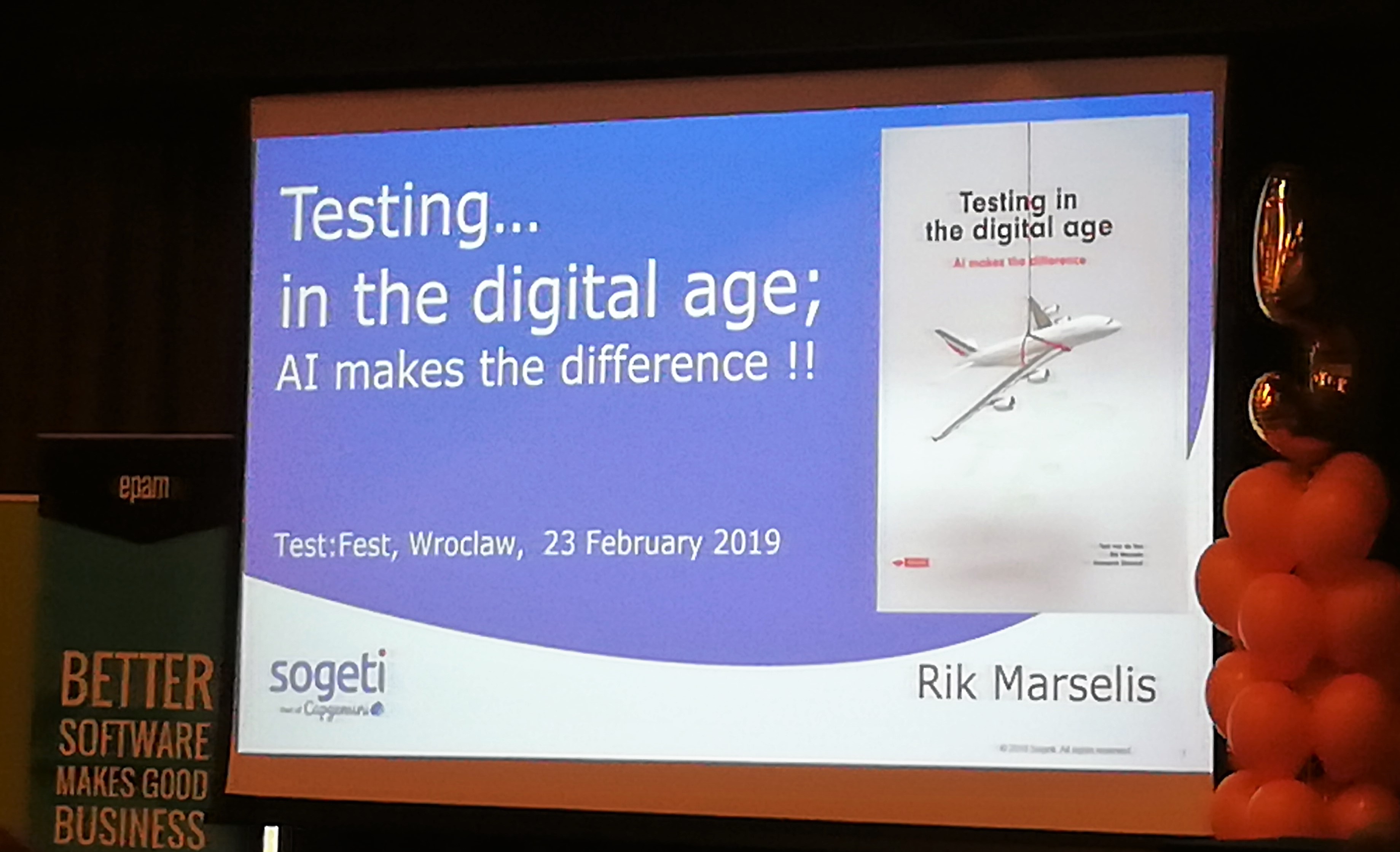 Rik Marselis jest współautorem książki Testing in the digital age, a wykład był przedstawieniem najważniejszych punktów w niej zawartych. Mieliśmy okazję posłuchać na czym polega testowanie inteligentnych maszyn. W takich testach Rik wyróżnia dwa obszary:
