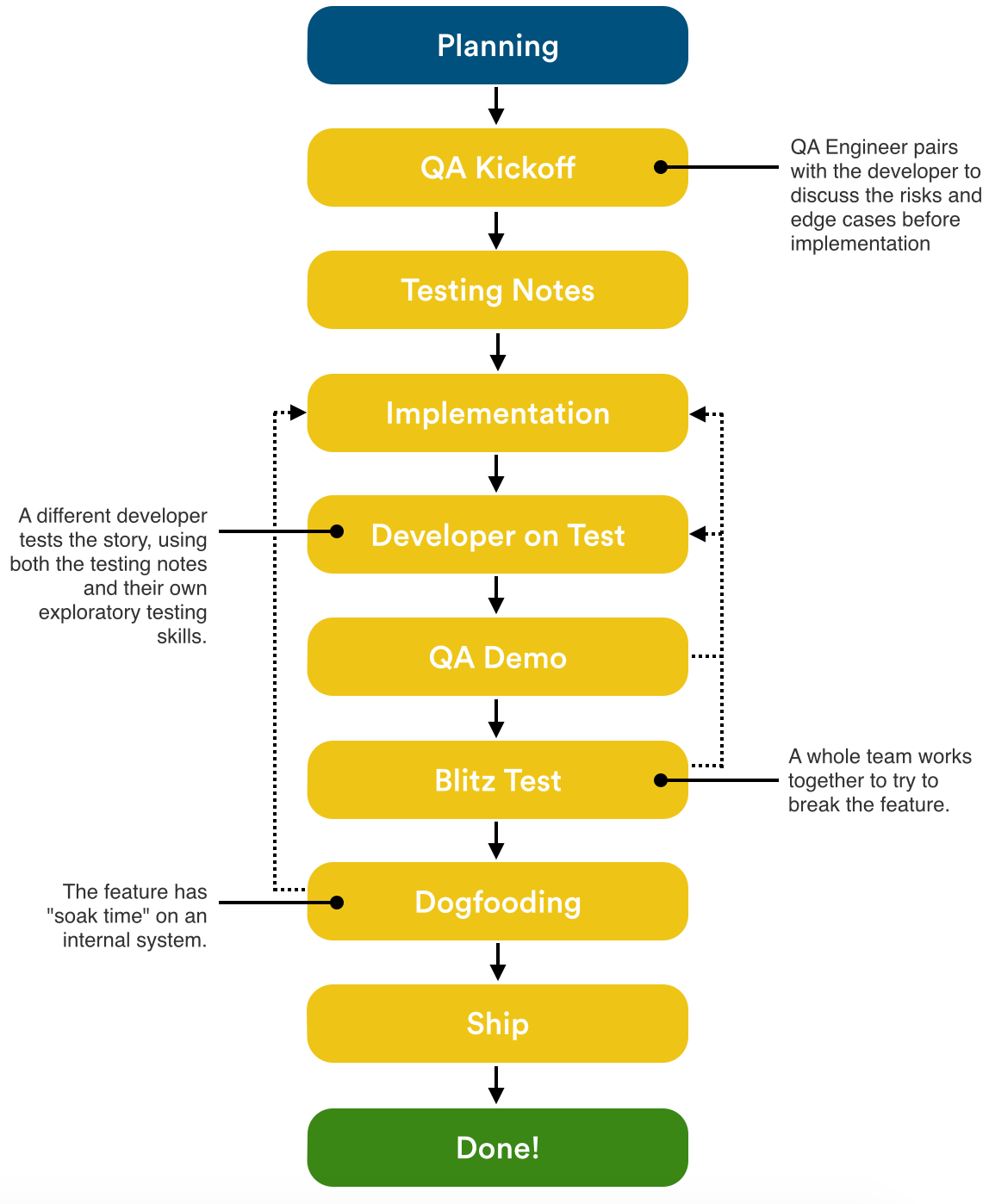 Takie podejście zwane Quality Assistance wprowadził Atlassian. Ma ono poprawić wydajność zespołu oraz zapewnić wyższą jakość dostarczanego kodu. Szybsze dostarczanie ma być osiągnięte dzięki redukcji ilości cykli code-test-rework-retest, a także zapobieganiu błędów. Rola Testera w dużej mierze ogranicza się do wskazania ryzyk, oraz przypadków granicznych do sprawdzenia przez developera. A to wszystko zanim zmiana zostanie zaimplementowana. Tester może też być zaangażowany do odbioru pracy developerów w ramach QA demo czy Sign off. Idealnie jednak, gdy zespół jest sobie w stanie poradzić bez testerów.