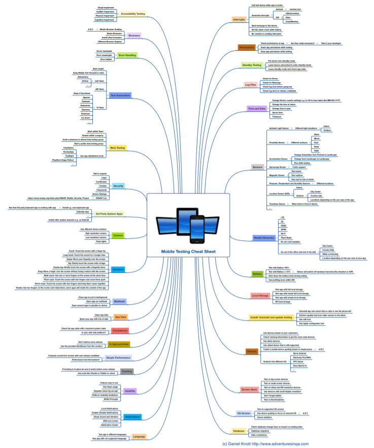 Nie jest to pełna lista, ale jak widać powyżej jest sporo punktów, z którymi możemy nie mieć do czynienia np. testując webówkę, a o których warto pamiętać podczas testów na urządzeniach mobilnych. Artykuł opracowałem na podstawie mind mapy przygotowanej przez Daniela Knotta, którą można znaleźć na adventuresinqa.com.