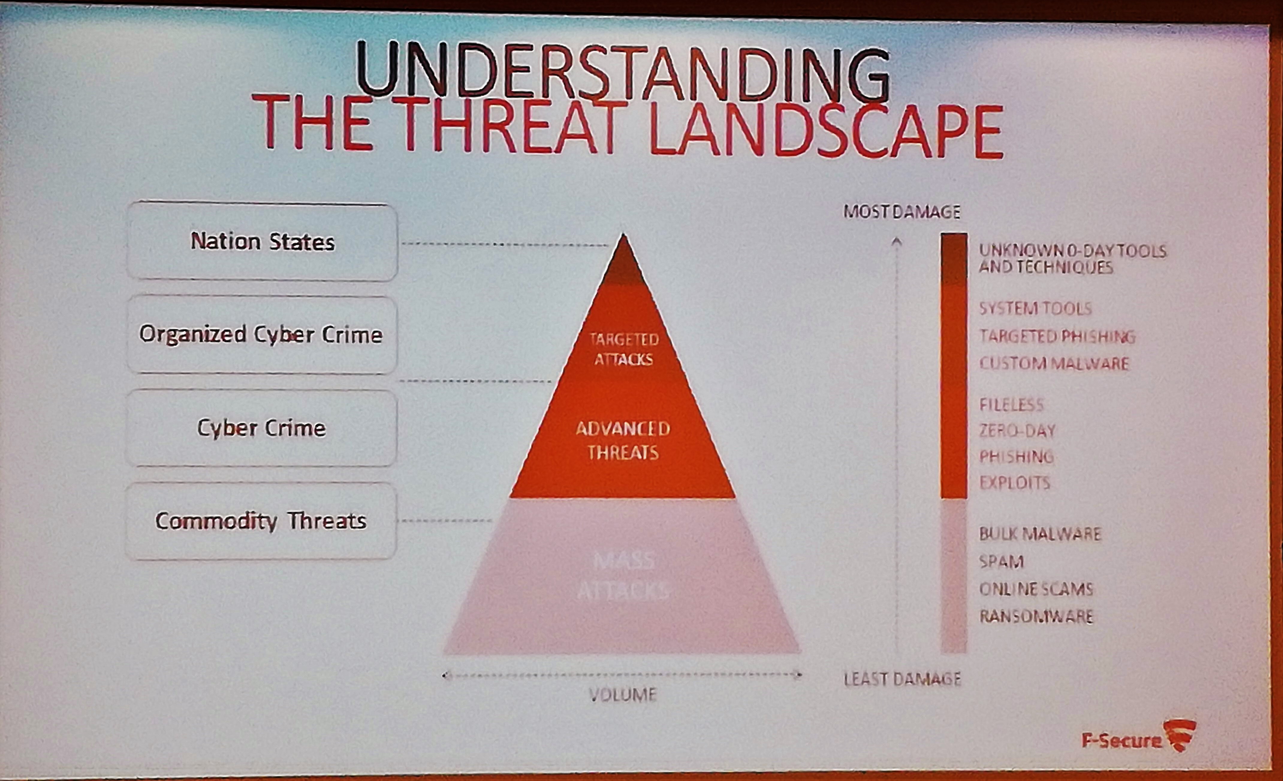 Konferencja zaczęła się od tematu związanego z bezpieczeństwem oraz kolejnymi wyzwaniami związanymi z tym zagadnieniem. Prezentacja była bardzo ciekawa. Na początku pojawiło się kilka statystyk odnośnie ilości ataków oraz lokalizacji skąd są wyprowadzane. Była też mowa o różnych typach ataków, z których wciąż najbardziej efektywnym jest phishing.