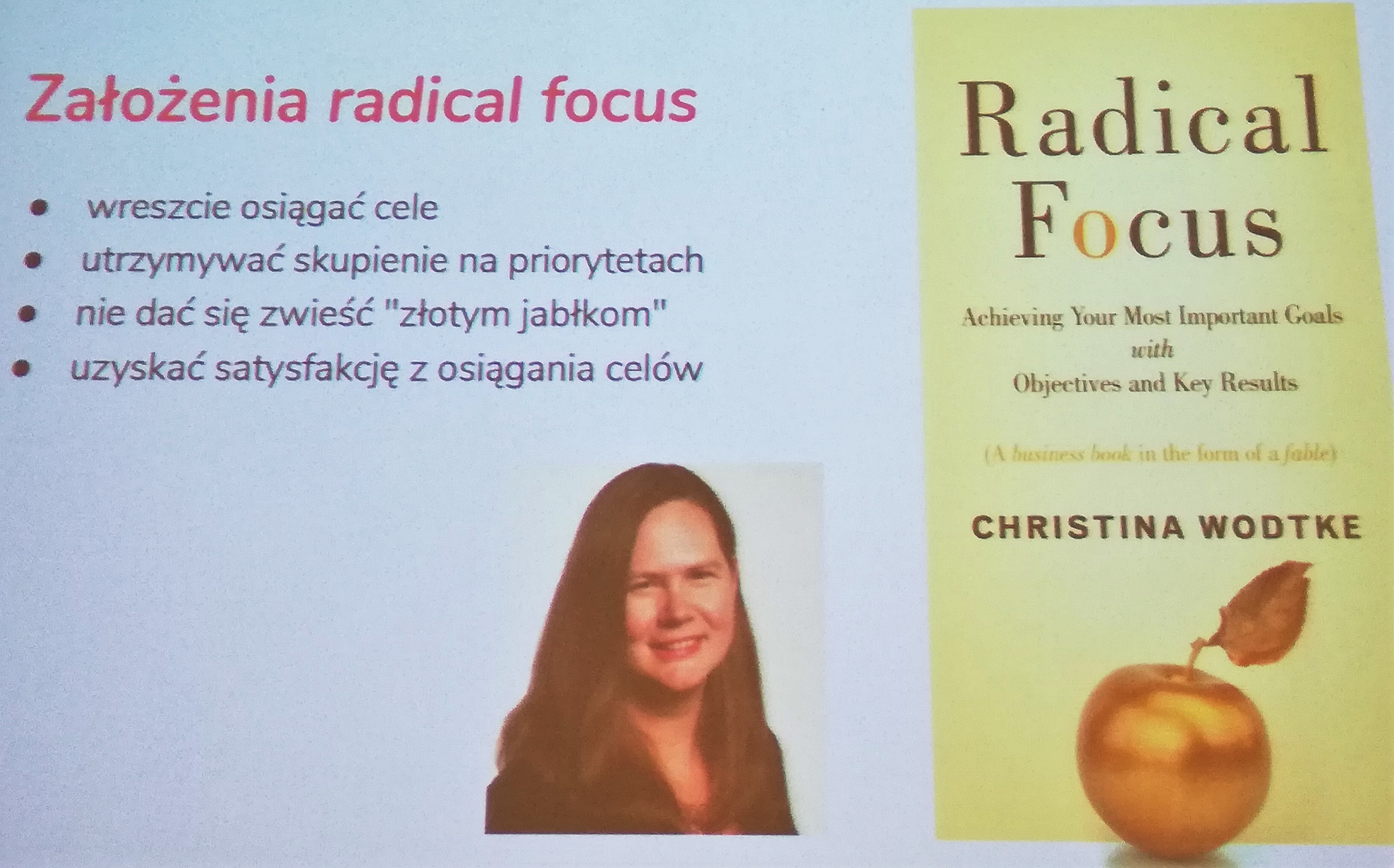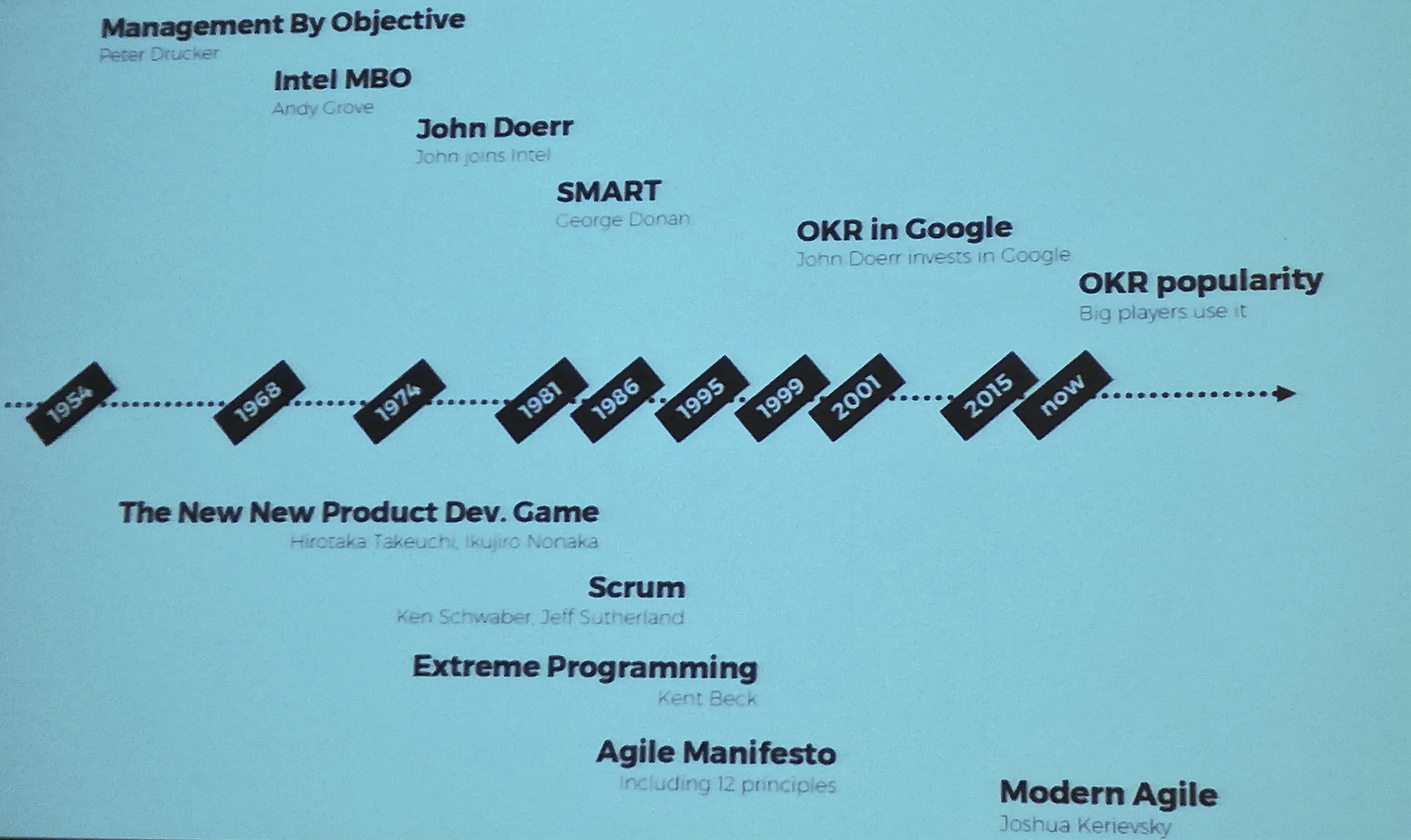 Na początku prezentacji przedstawiony został zarys historyczny i narodziny OKR – Objectives and Key Results. Idea narodziła się kilkadziesiąt lat wcześniej niż Scrum, który jest powszechnie znany. Przyznam, że wcześniej nie słyszałem o tej technice skutecznego stawiania celów. Po tej prezentacji będzie to temat do dalszego zgłębienia.