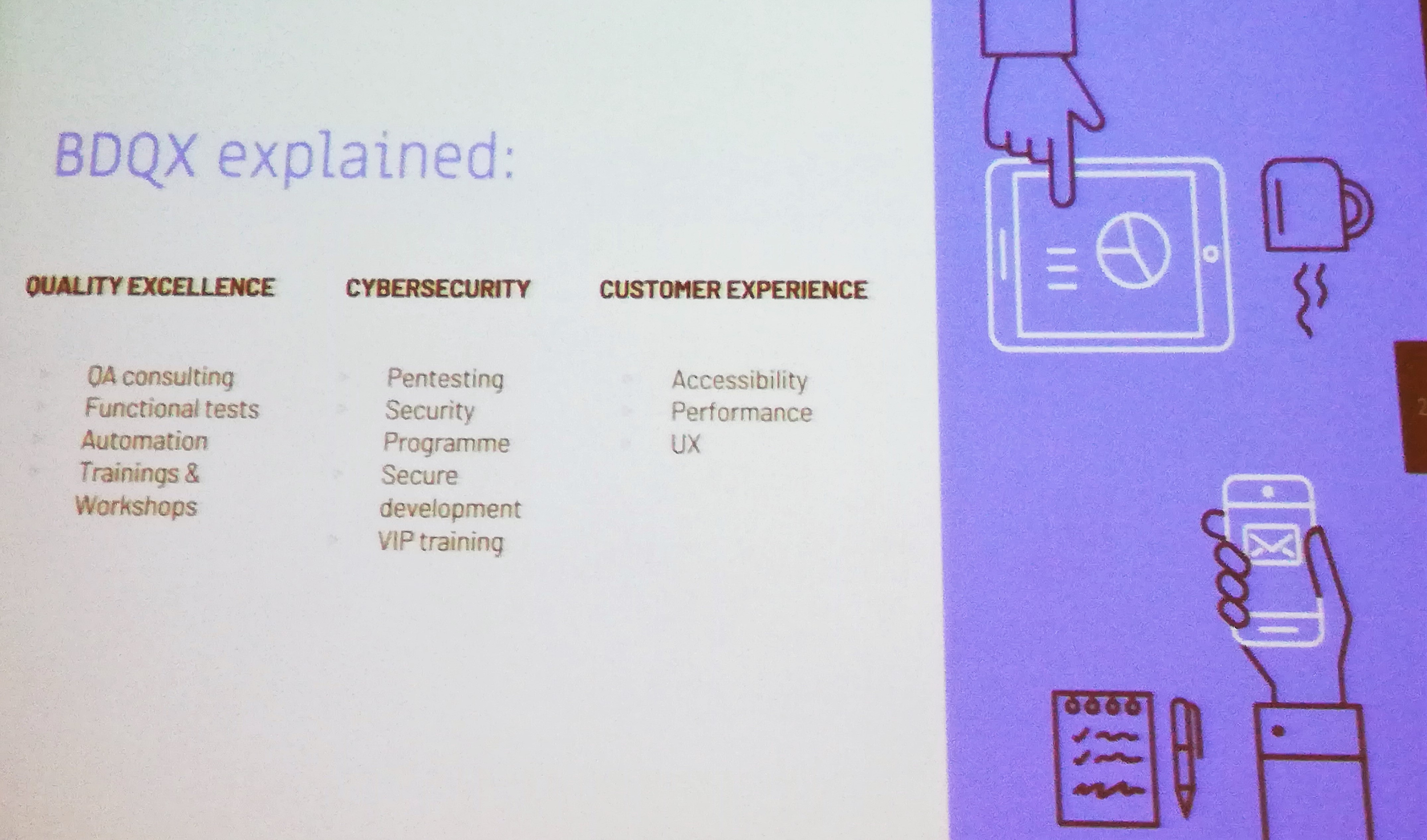 Niestety ten punkt zdecydowałem się ostatecznie odpuścić ze względu na narastające zmęczenie i widmo drogi powrotnej. Bardzo chciałem zobaczyć tą prezentację, ponieważ zwykle na konferencjach jest co najmniej jedno takie wystąpienie z innej bajki. Patrząc na opis, miałem wrażenie, że to będzie właśnie to. Zwykle rzucają one zupełnie nowe spojrzenie na testowanie, przynajmniej dla mnie tak jest. Dlatego bardzo sobie je cenię. No cóż tym razem, nie posłuchałem.
