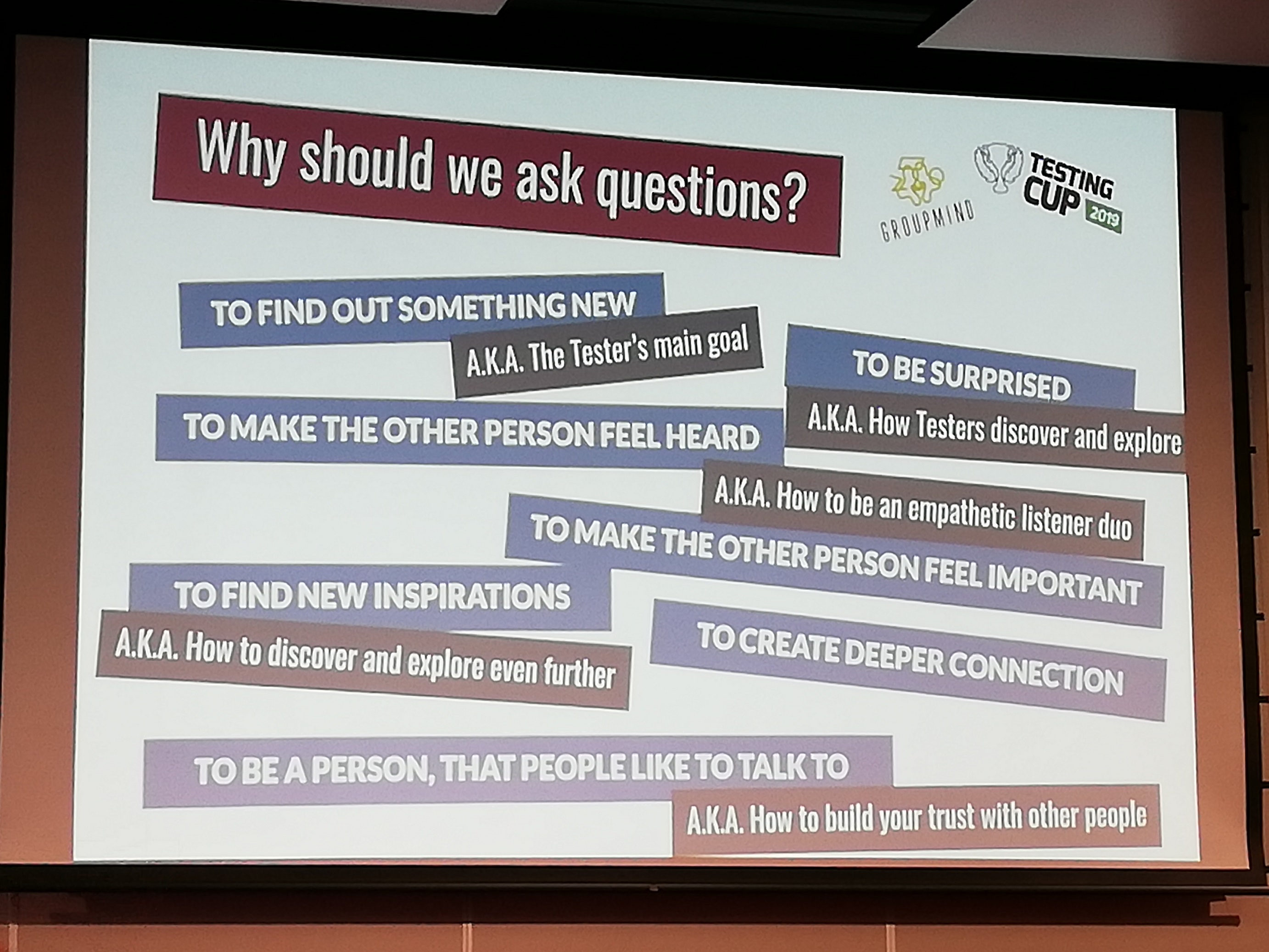 Tym razem było to spotkanie z Agnieszką Matan, Piotrem Gasikiem. Są to ludzie, którzy zajmują się improwizacjami. Prelekcja wzbogacona była kilkoma ciekawymi ćwiczeniami, a całość poświęcona była komunikacji, umiejętności słuchania, zadawania pytań oraz zaangażowania w rozmowę. Bardzo ważne zagadnienia dla każdego testera.