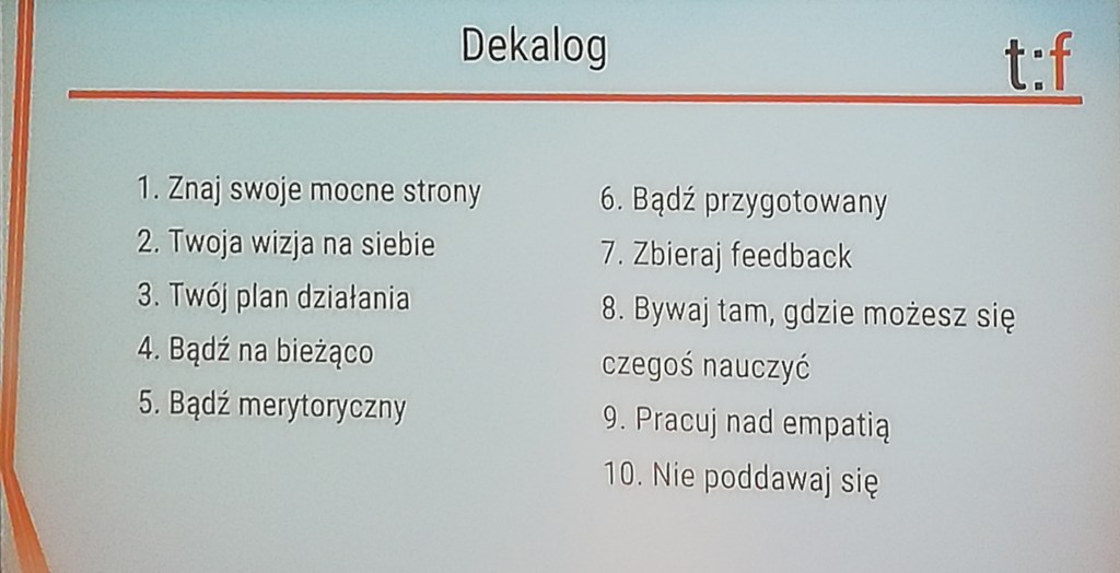 Marta opowiedziała o budowaniu marki osobistej. Temat bardzo popularny w ostatnim czasie. Na początku przedstawiła definicję marki osobistej. Później przyszedł czas na narzędzia, z których można skorzystać, by lepiej poznać siebie – nasze mocne strony, jaki sposób pracy nam bardziej odpowiada. Jedną z metod jest także feedback od najbliższych osób, który dostarcza wiele informacji na temat tego jak jesteśmy postrzegani i jak się z nami pracuje.