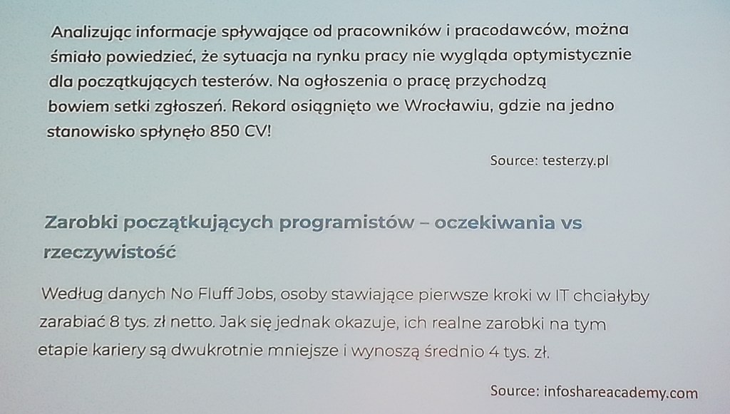 Tomek zwrócił uwagę na coraz trudniejszą sytuację na rynku testerów. Z jednej strony coraz więcej osób przekwalifikowuje się na testera. Z drugiej coraz większa część testów realizowana jest przez inne role np. developerów. Jedno z drugim nie bardzo się zgrywa.