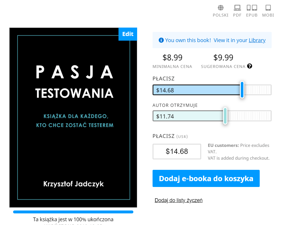 Leanpub bardzo mi się spodobał. Tworzenie książki i wszelkie ustawienia są bardzo proste. Bardzo klarowne jest również, jaką kwotę dostaje autor od każdej sprzedanej książki. Leanpub pobiera 20% tego, co kupujący zapłaci. Celowo tak piszę, ponieważ autor ma możliwość ustawienia ceny minimalnej oraz ceny sugerowanej. Ale na tym nie koniec. Kupujący może zapłacić jeszcze więcej przesuwając suwaczek w prawo.