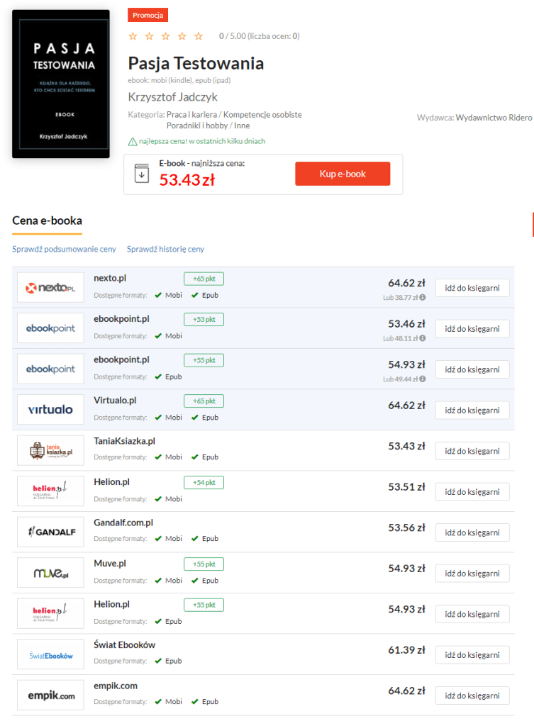 Kolejną zaletą Ridero jest możliwość publikacji książek w księgarniach współpracujących z Ridero. To pozwala uzyskać większy zasięg potencjalnych odbiorców. Dzięki temu moja „Pasja Testowania” dostępna jest w helion.pl, taniaksiazka.pl czy na empik.com. Tytuł pojawia się także częściej w wynikach wyszukiwania w Google.