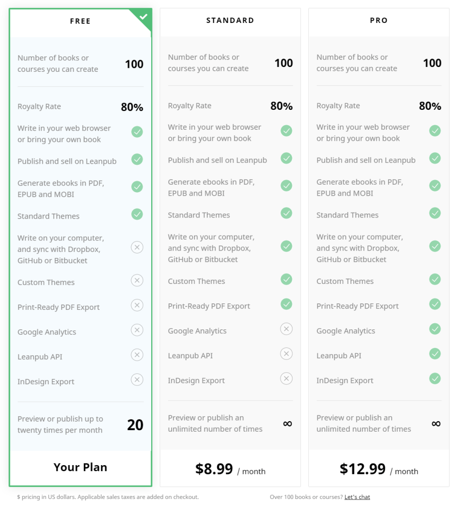 Leanpub jest kanadyjskim portalem oferującym (w podstawowym pakiecie) możliwość darmowej publikacji swoich książek oraz kursów. Istnieje kilka możliwości tworzenia własnych treści. W darmowej wersji książkę można pisać w przeglądarce lub wrzucić gotowy plik w formatach: PDF, EPUB, MOBI. W wyższych planach (standard oraz pro), książkę można pisać na komputerze, a synchronizacja treści odbywa się z wykorzystaniem Dropboxa, GitHuba lub Bitbucketa.