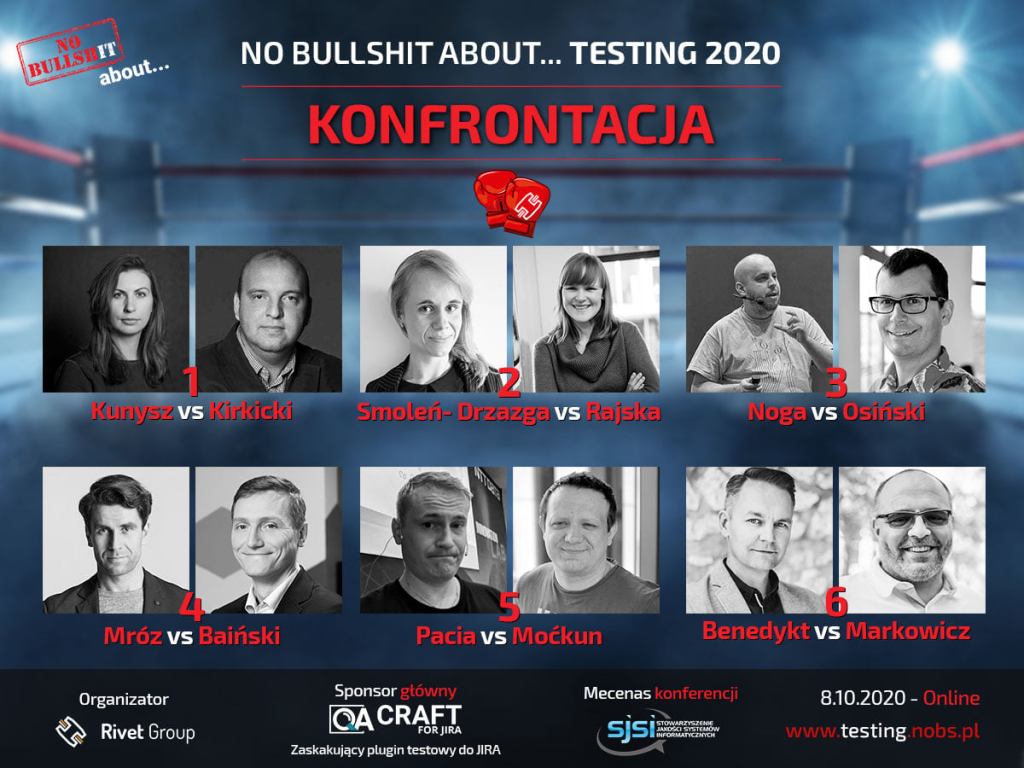 No Bullshit about Testing tym razem w formie online odbędzie się 8. października. Organizatorzy podzielili się agendą. Co ciekawe konferencja będzie w formie sparingów merytorycznych. Poniżej znajdziecie pary, które się za sobą zmierzą.