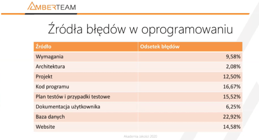 Pierwsza prelekcja była rozważaniem na temat jakości, testowania oraz innych sposobów na dostarczanie produktów wysokiej jakości. Prelegent przytaczał różne dane, które z jednej strony pokazywały skąd błędy się biorą – jak poniżej.